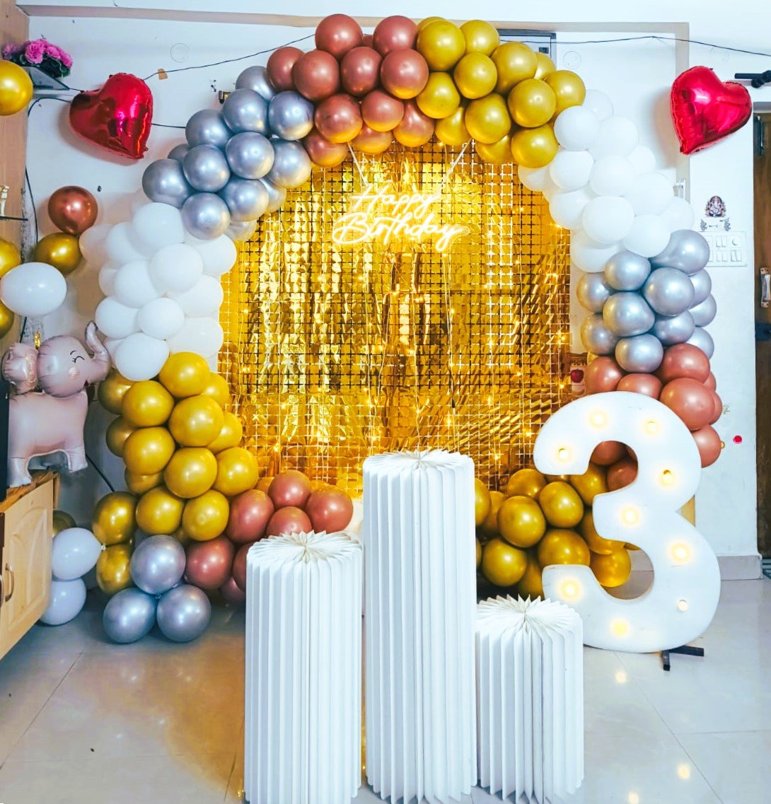 - Balloons in Rose Gold Chrome, Chrome Gold, Silver Chrome, and White
